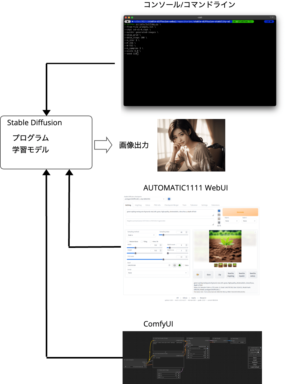 入力ミスもありますし、分かりにくいためGUI(グラフィカル・ユーザー・インターフェイス)をフロント側、Stable Diffusionをバック側として使うのが一般的になっています。
