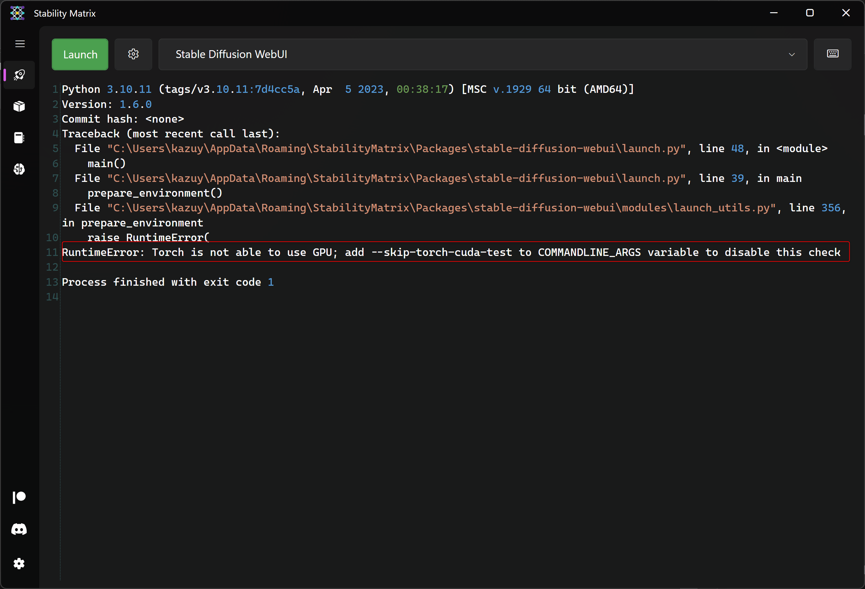 エラーメッセージでは、「–skip-torch-cuda-test」を起動引数に追加するよう表示されています。