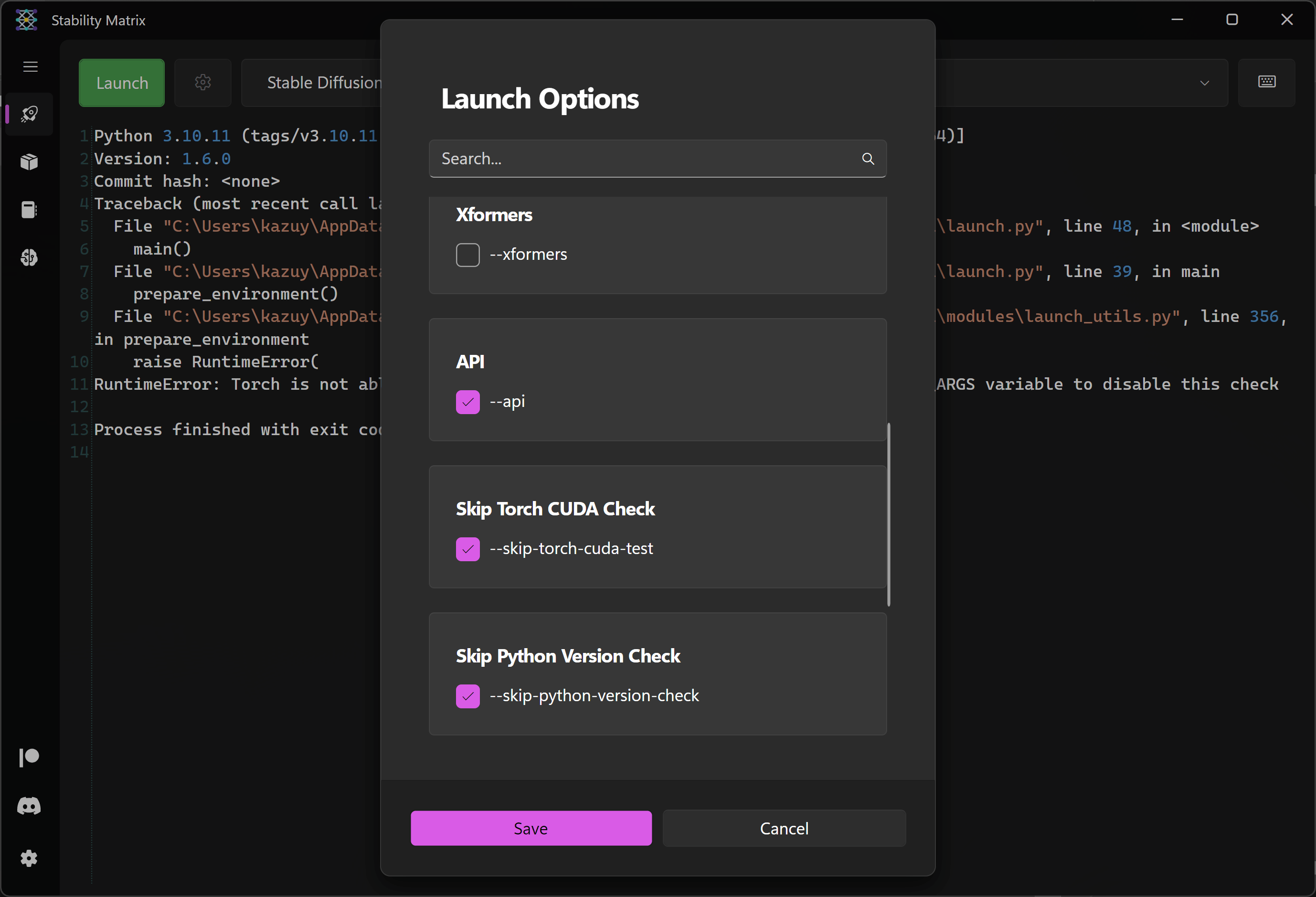 設定ボタン(歯車アイコン)をクリックすると、起動オプションが表示されますので「–skip-torch-cuda-test」にチェックを入れます。