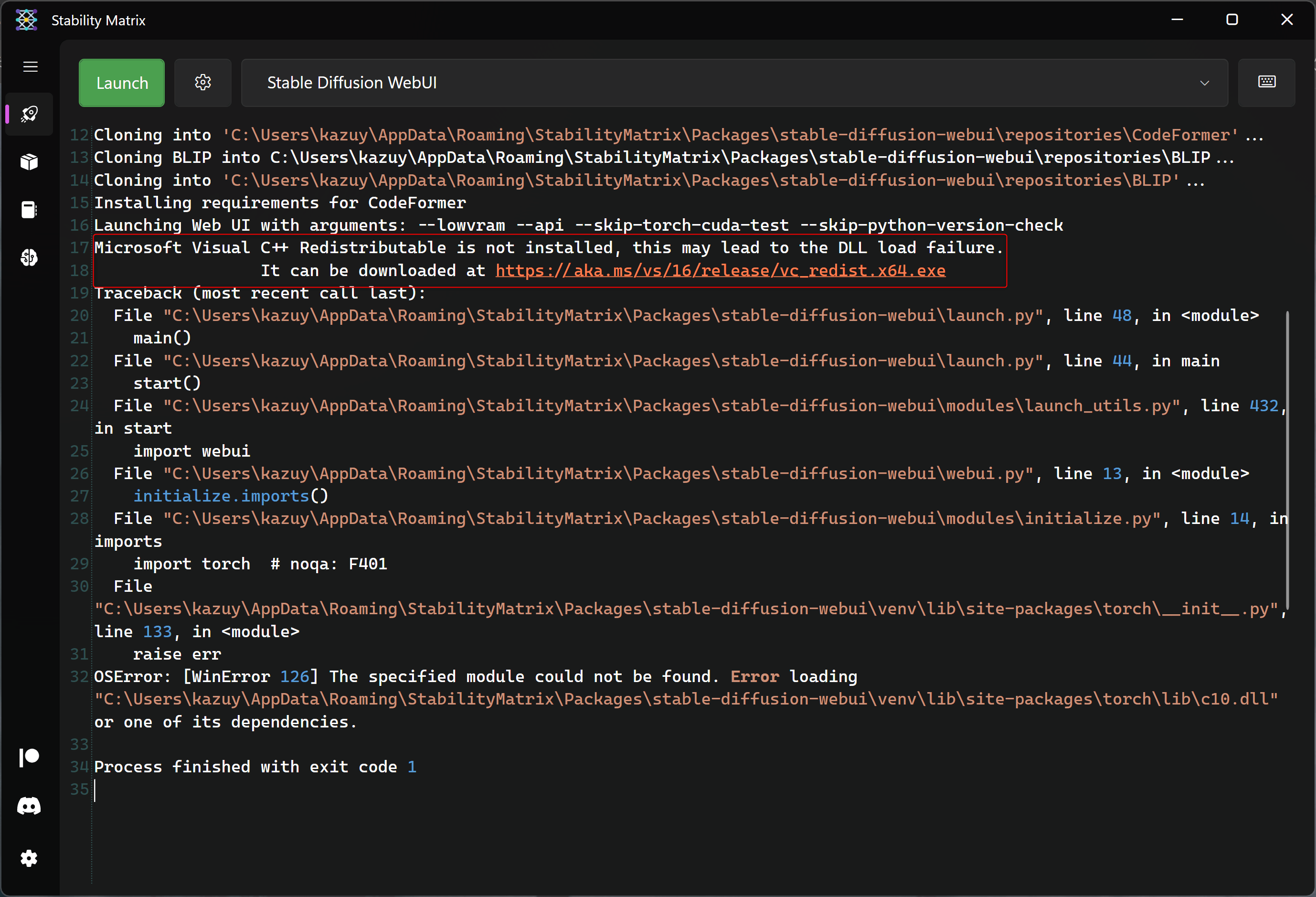StabilityMatrixのインストール時に、C++ランタイムのインストール用ウィンドウが開きましたが、間違えて閉じてしまったためです。