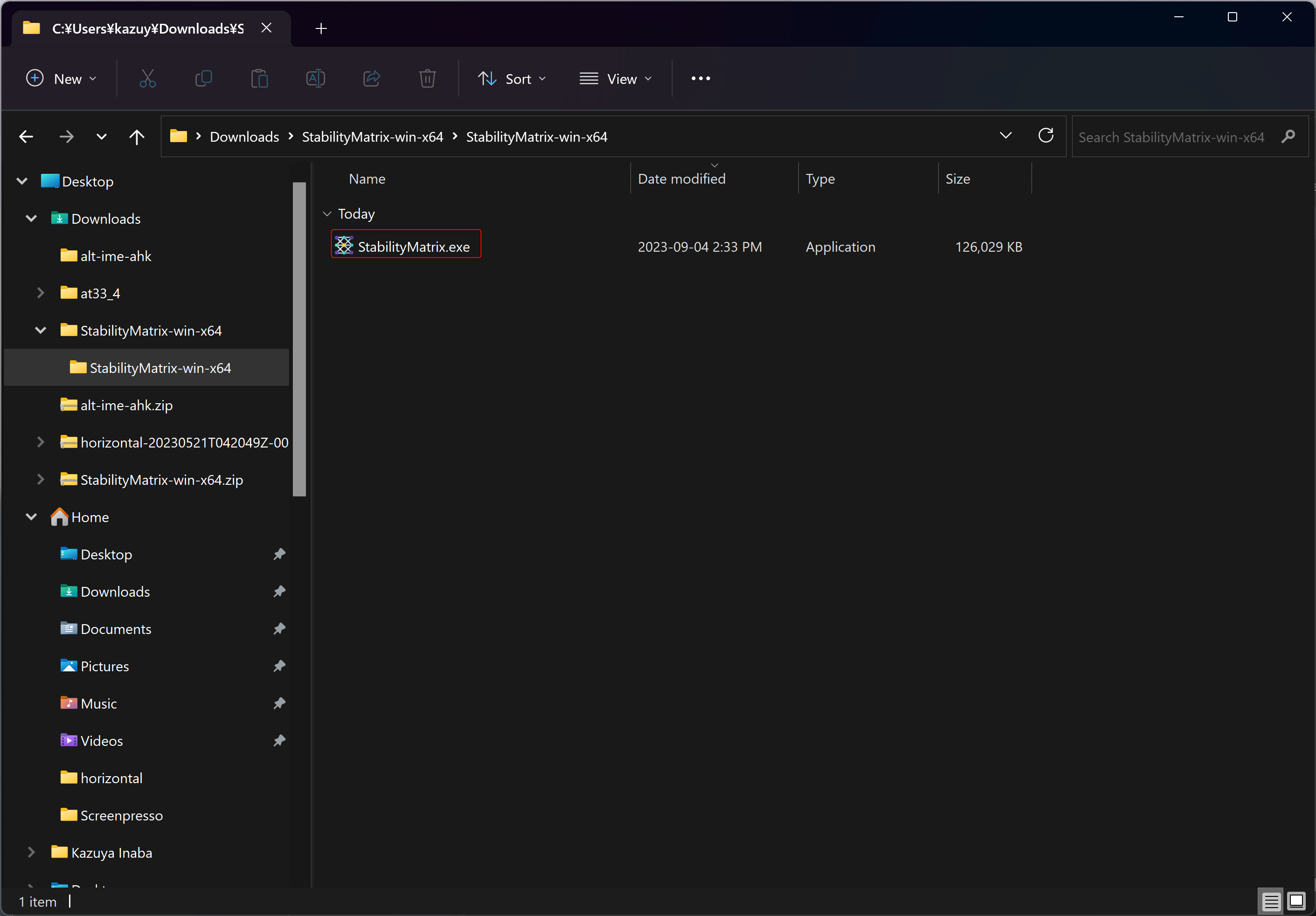 Windowsの場合には、「StabilityMatrix-win-x64.zip」を、Macの場合には、「StabilityMatrix.AppImage」をダウンロードし解凍します。
