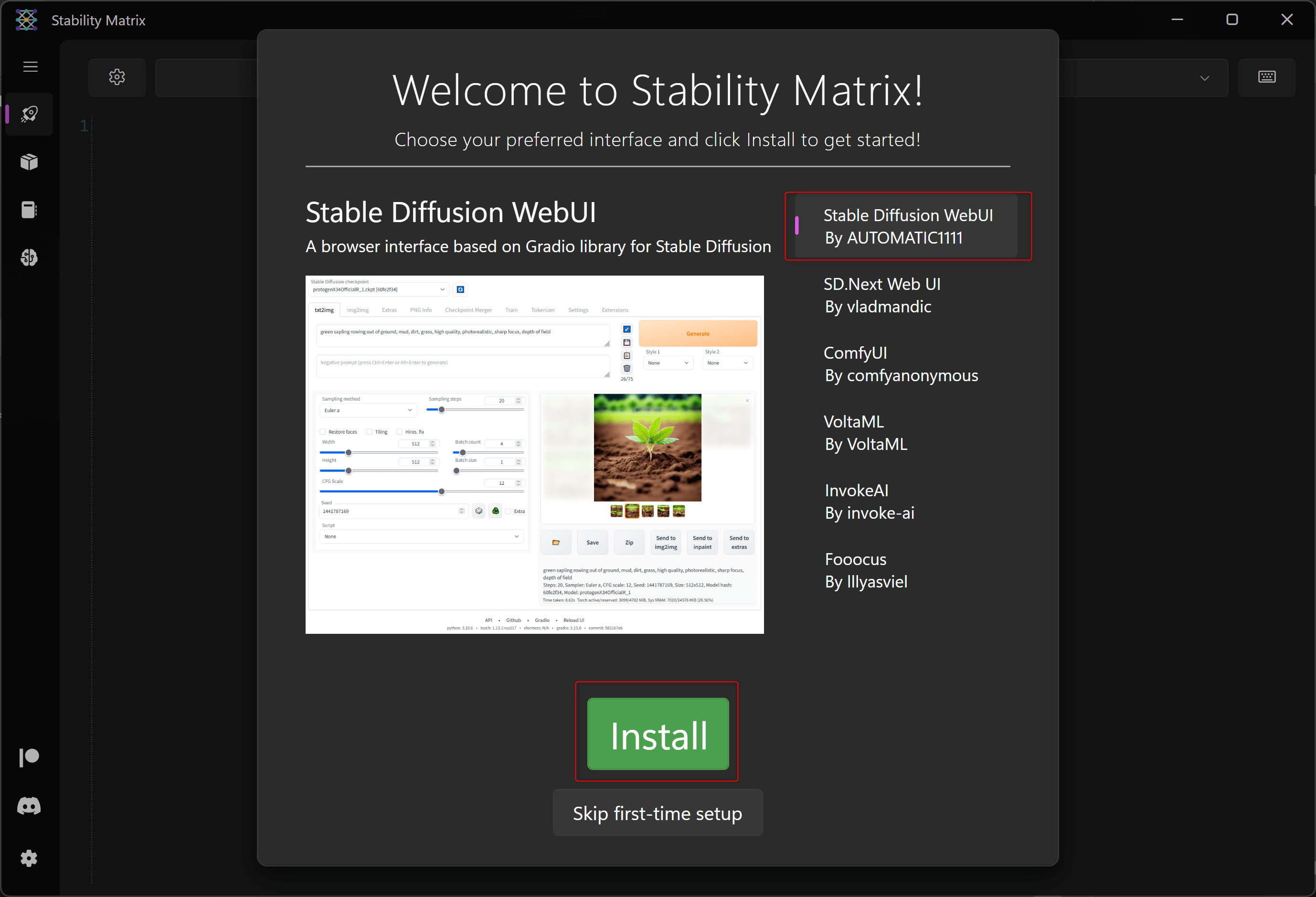 Stable Diffusionのフロント側ユーザー・インターフェース(AUTOMATIC1111 WebUI, ComfyUI、SD.Next、VoltaML、InvokeAI、Fooocus)を全てワンクリックでインストールできる優れものです。
