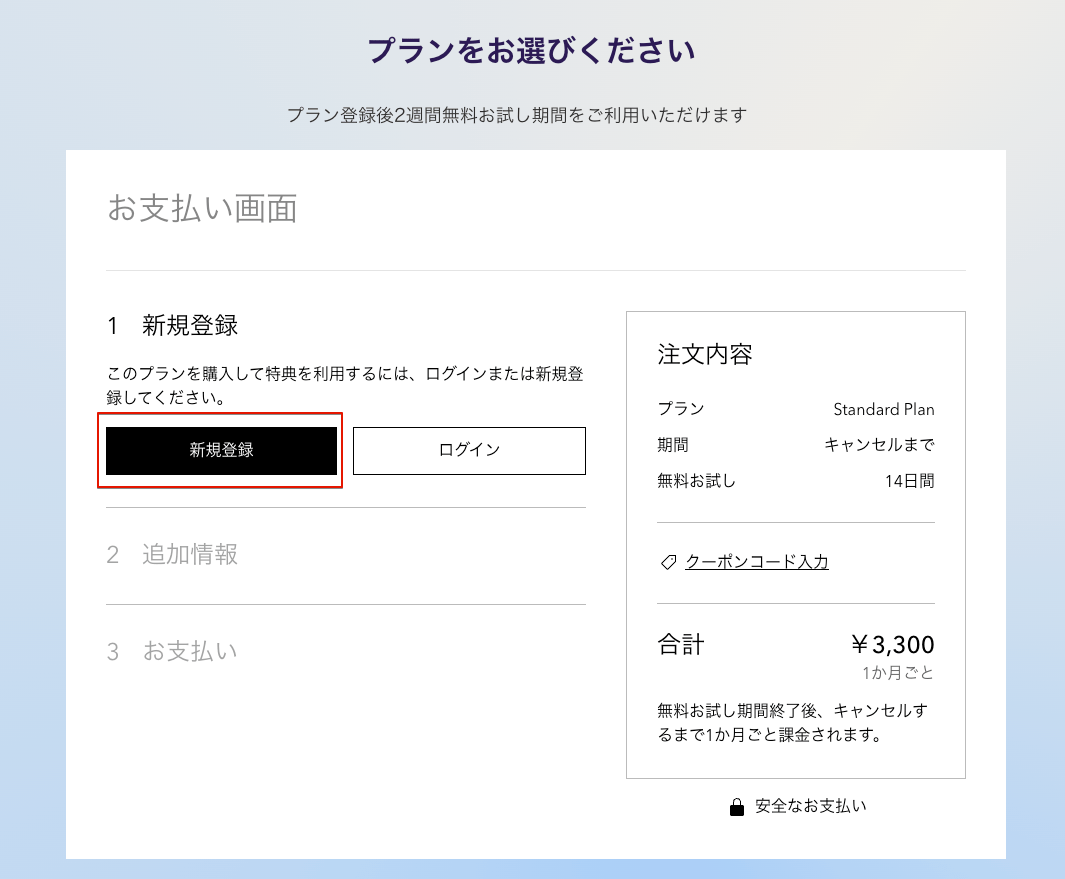 プランを選択すると、アカウントの新規登録、または、ログインが必要になります。アカウントを持っていませんので「新規登録」ボタンをクリックします。