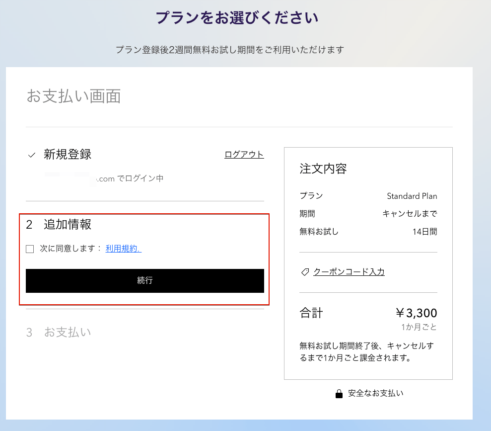 次に、追加情報として利用規約に同意するにチェックを入れ「続行」ボタンをクリックします。