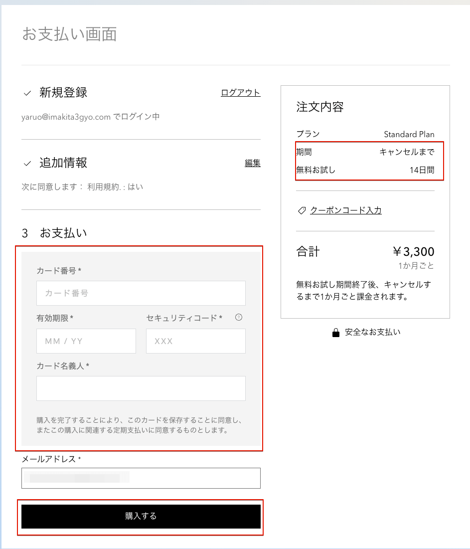クレジットカード情報を入力し「購入する」ボタンをクリックします。