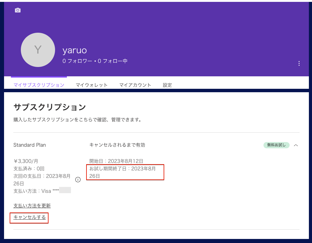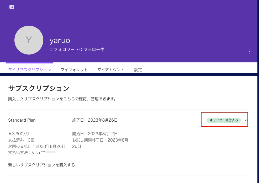 マイサブスクリプション画面で「キャンセル受付済み」と表示されているのを確認します。