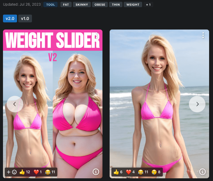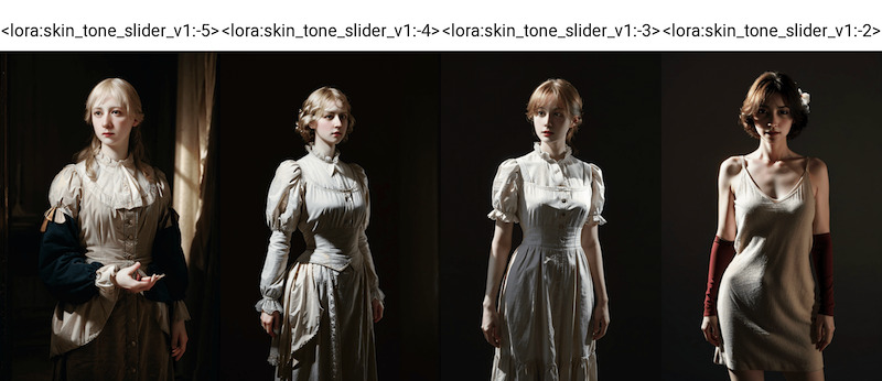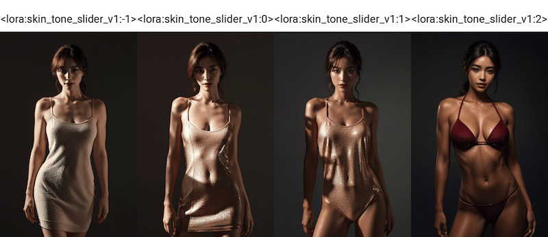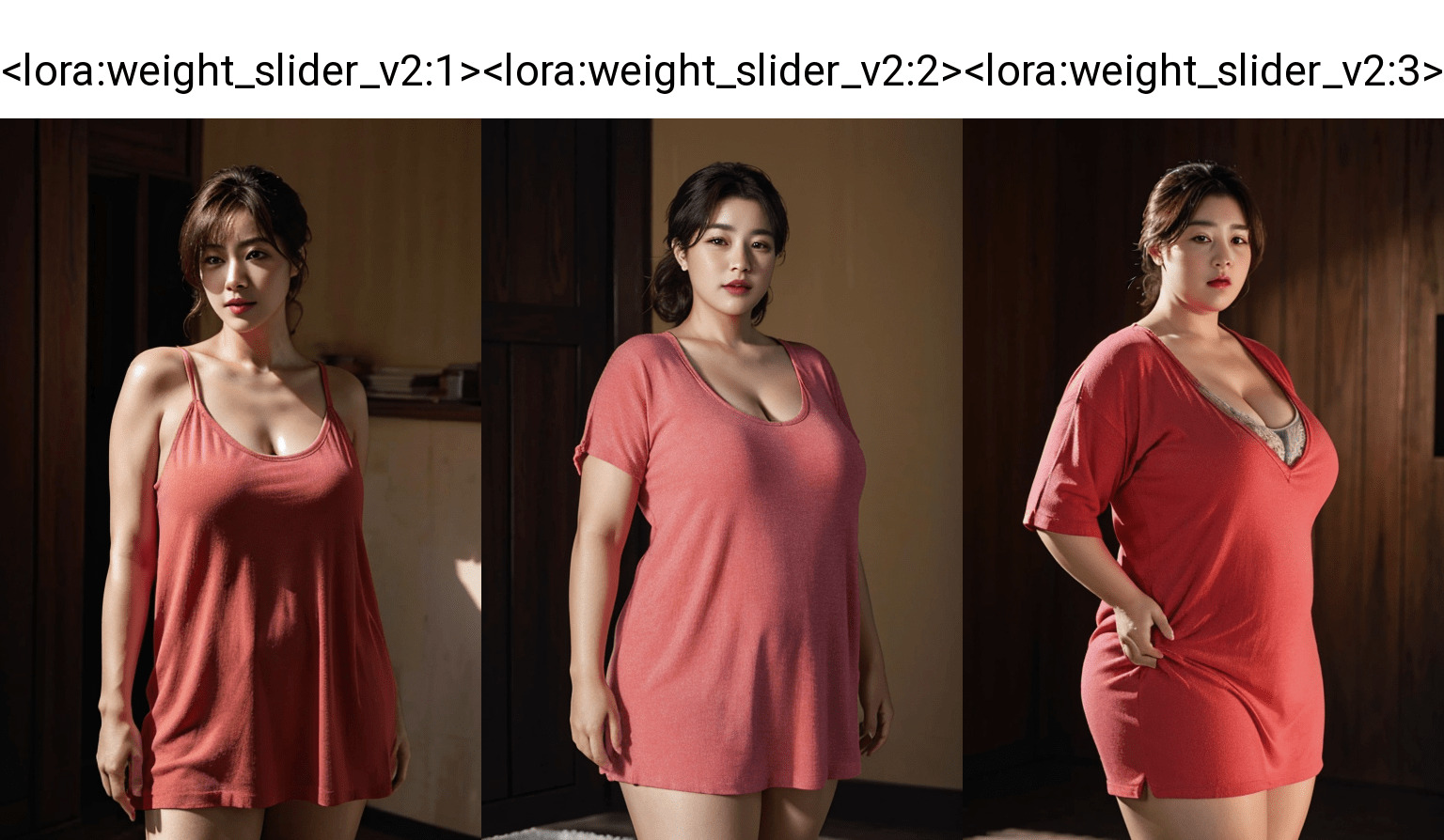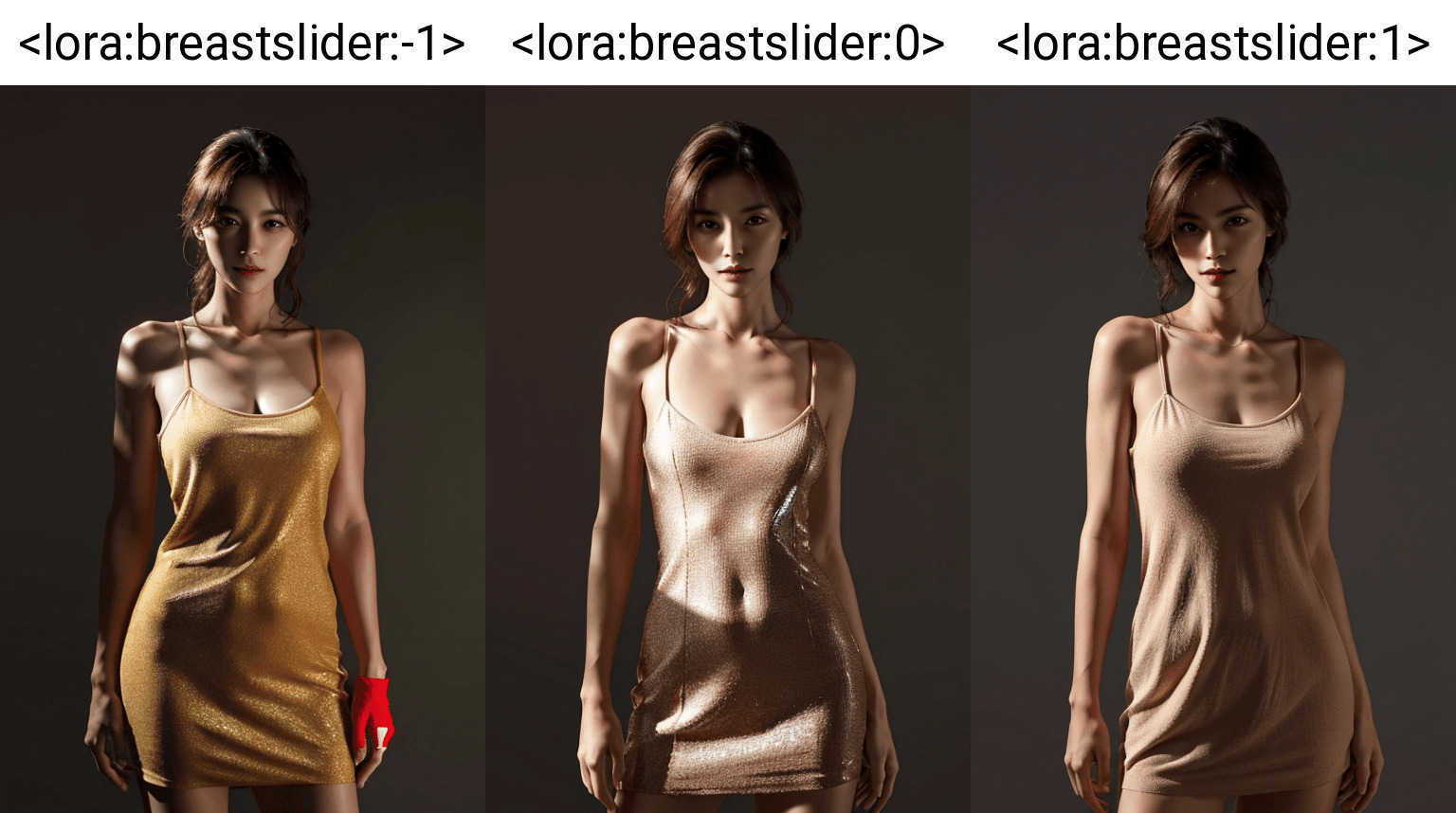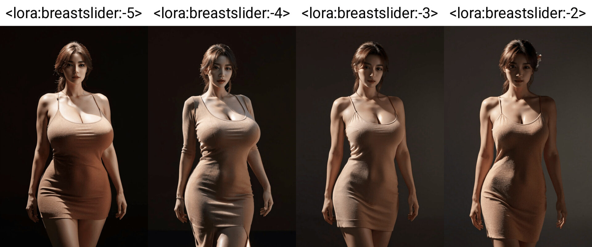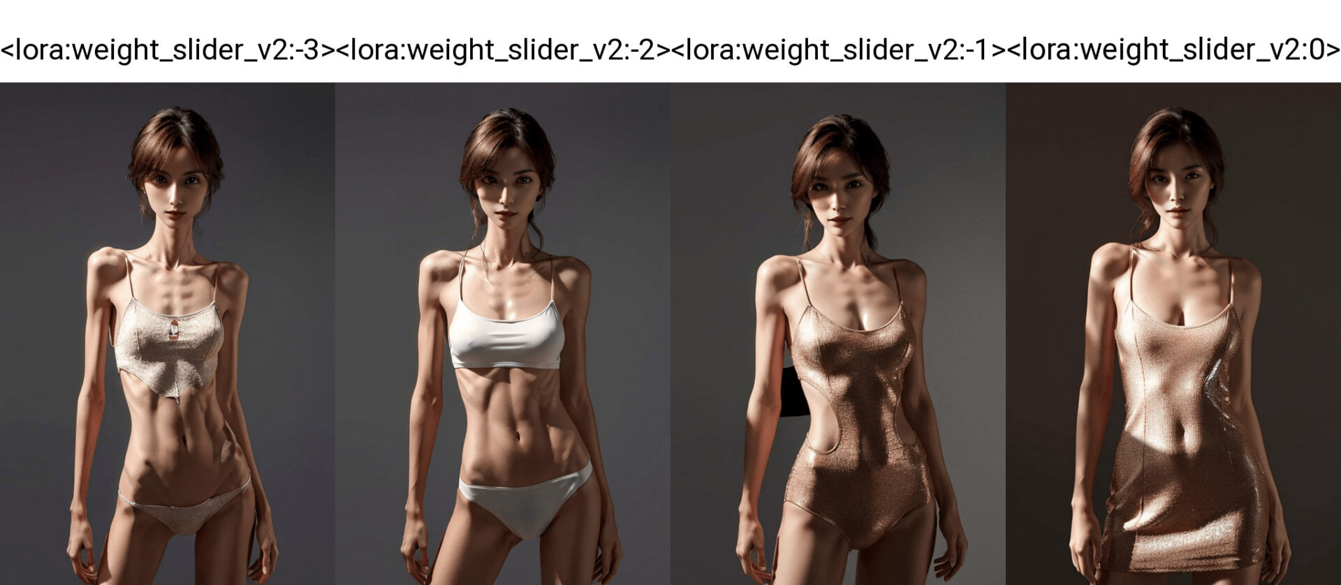 LoRAの重み付けは、-3.0〜3.0で、プラスの方が豊満でマイナスになるほど痩せ細ります。