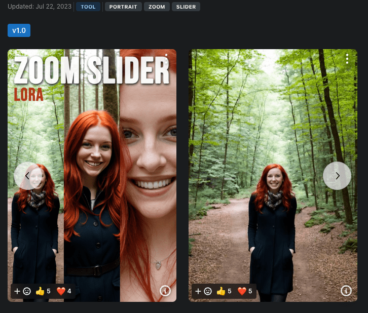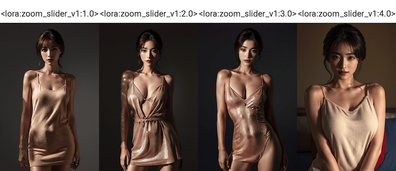 このLoraの重み付けは、-7.0〜7.0だそうですが、1〜3はスムーズにZoomしないで服が替わる引っかかる(hang)する部分があるそうです。