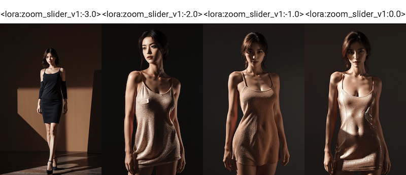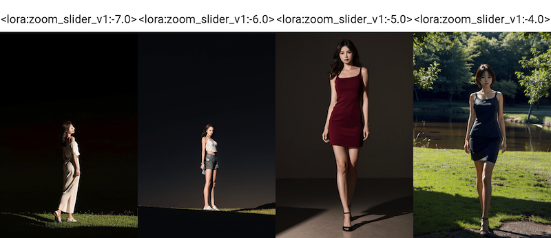 プロンプトで構図、カメラアングル、カメラポジションで対象の大きさをある程度はコントロールできます。Zoom Sliderを使うとLoRAの重み付けで対象との距離が変わります。