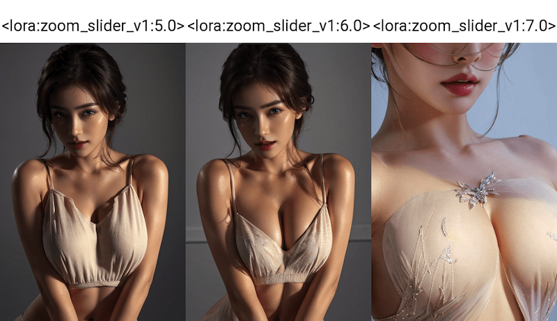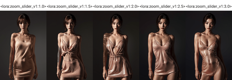以下の画像は、1〜3を0.5刻みで変化させています。LoRAページの詳細にあるように、ズームインしていないようです。