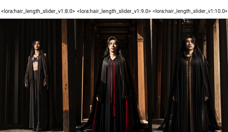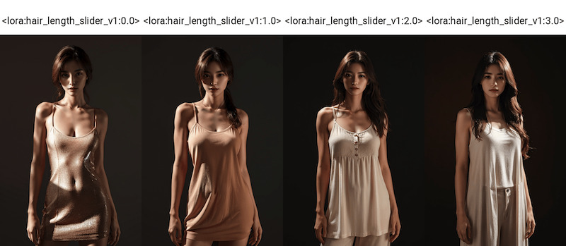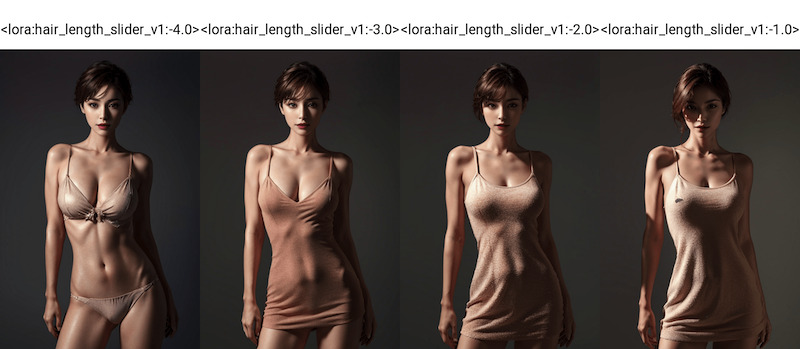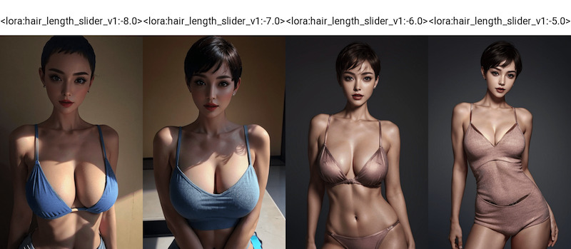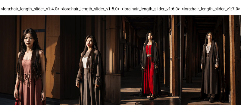 LoRAは、重み付けで効き具合(影響度)が変わります。大きさ、長さなど連続するものをLoRAの重み付けを使って画像を調整するものをスライダーと呼んでいるようです。