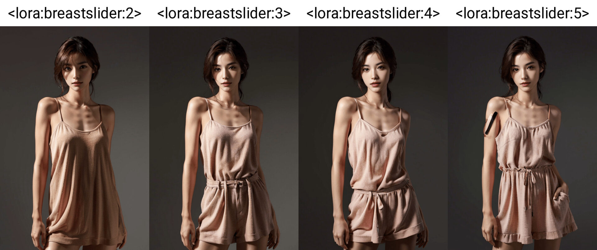LoRAなしの画像と比較すると、-2以下だと構図自体が変わり3を超えた時点ズームインしていますが、ポーズや衣装が変わっています。