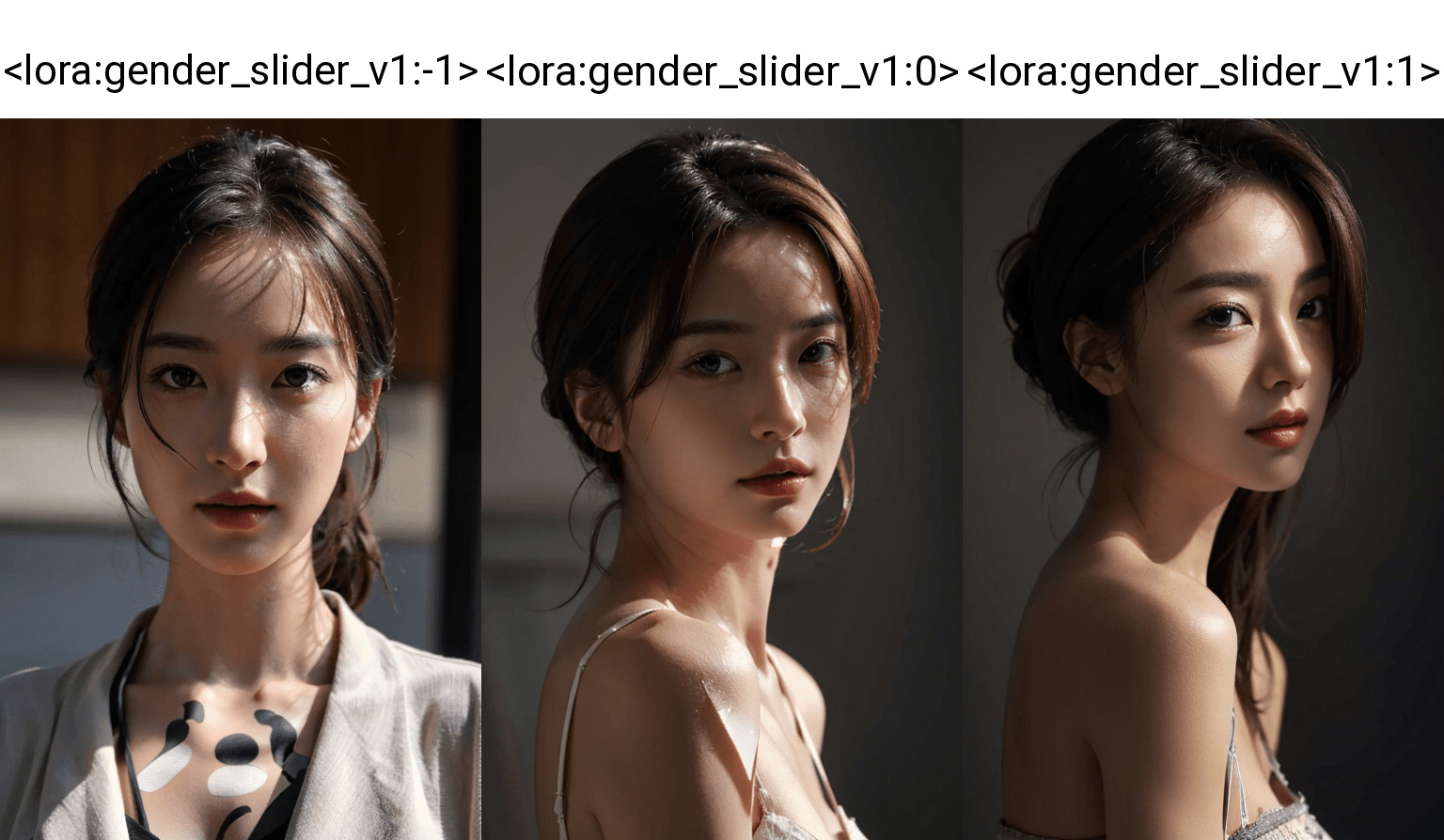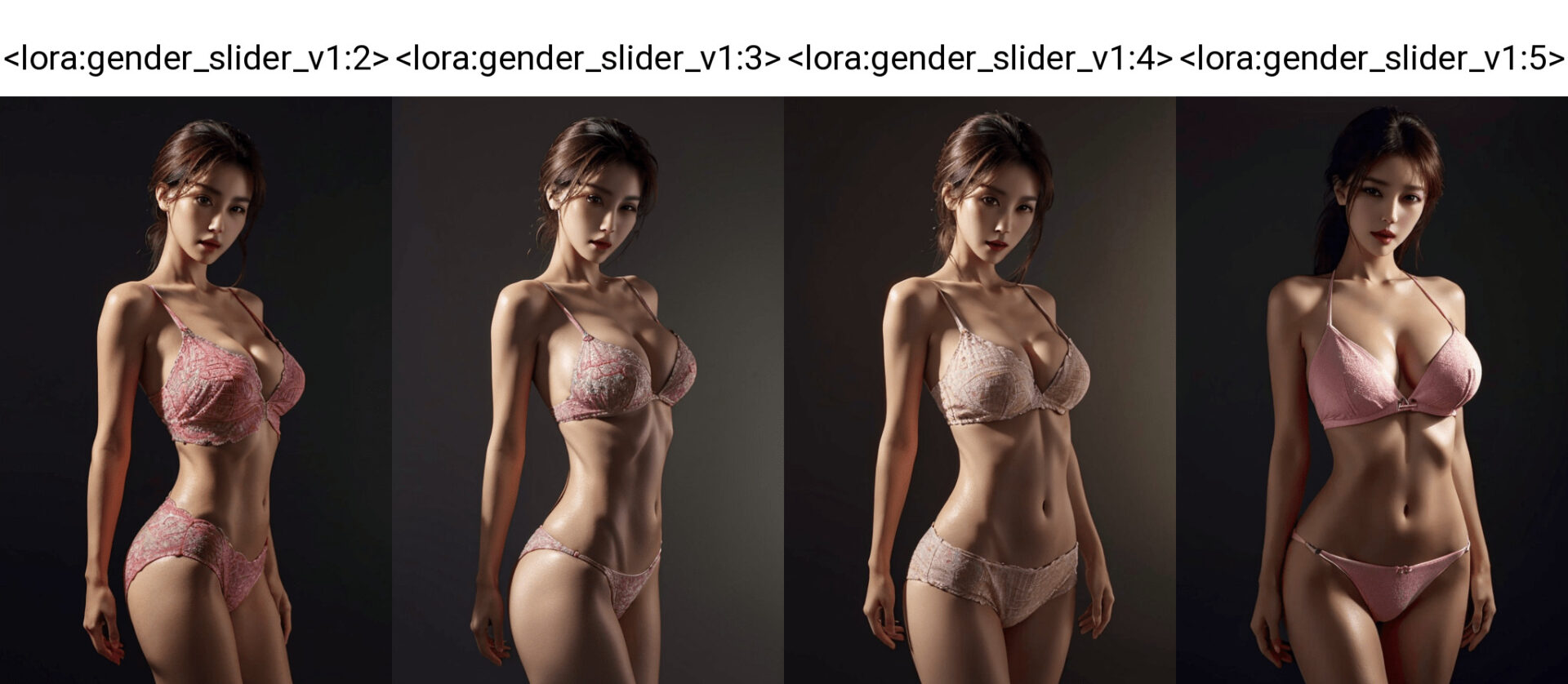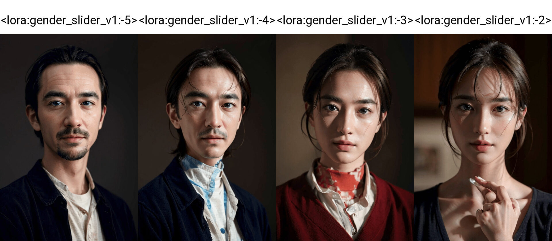 この画像で使用しているモデルが女性を出しやすいモデルですので、他のモデルを使うと女性に変化する重みが変わるかも知れません。