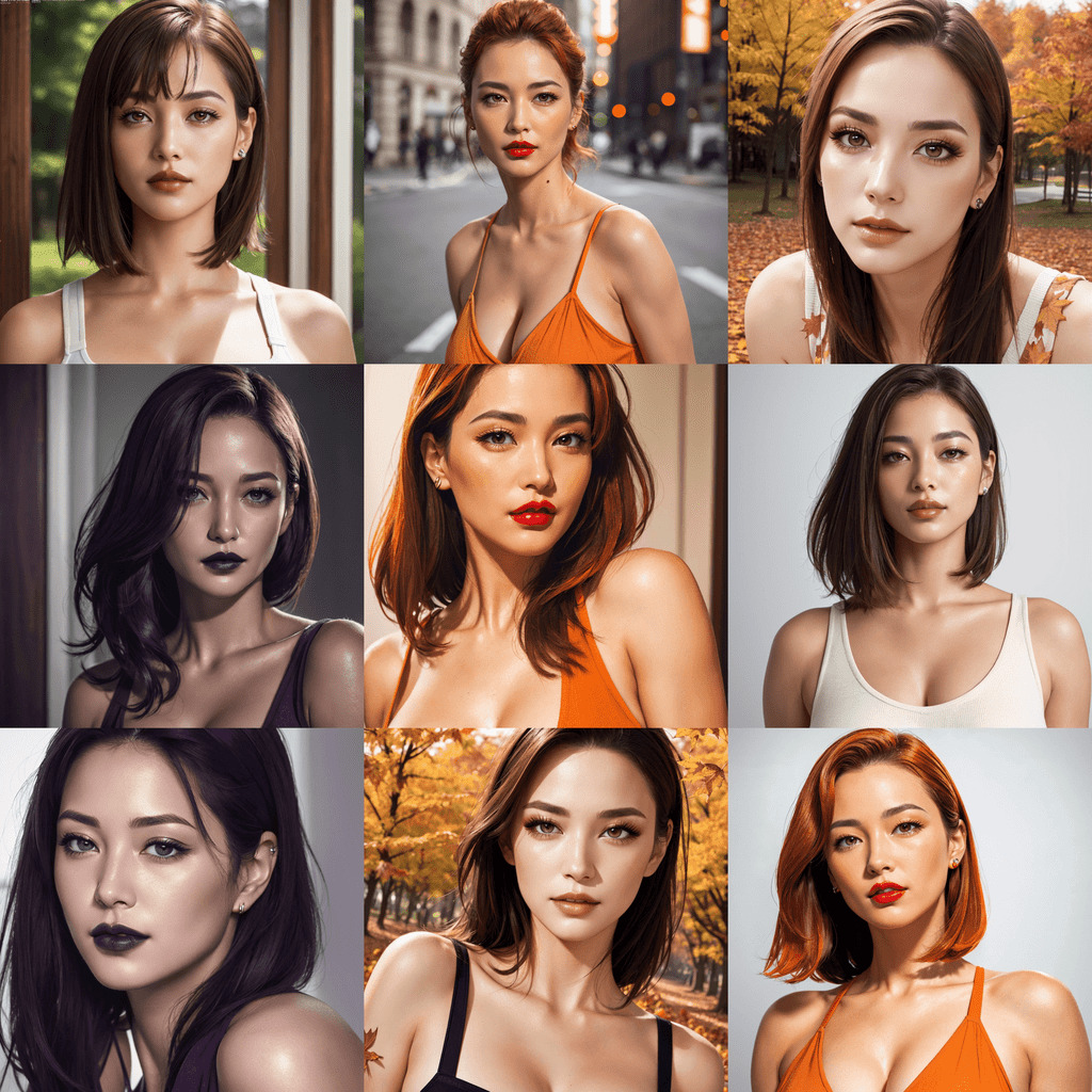 best quality,ultra high res,(photo realistic:1.4),1 woman, upper body shot, {(Autumn Makeup:1.4) | (Orange Red lips:1.4) | (Dark Plum lips:1.4) | (Maron brown lips:1.4)}