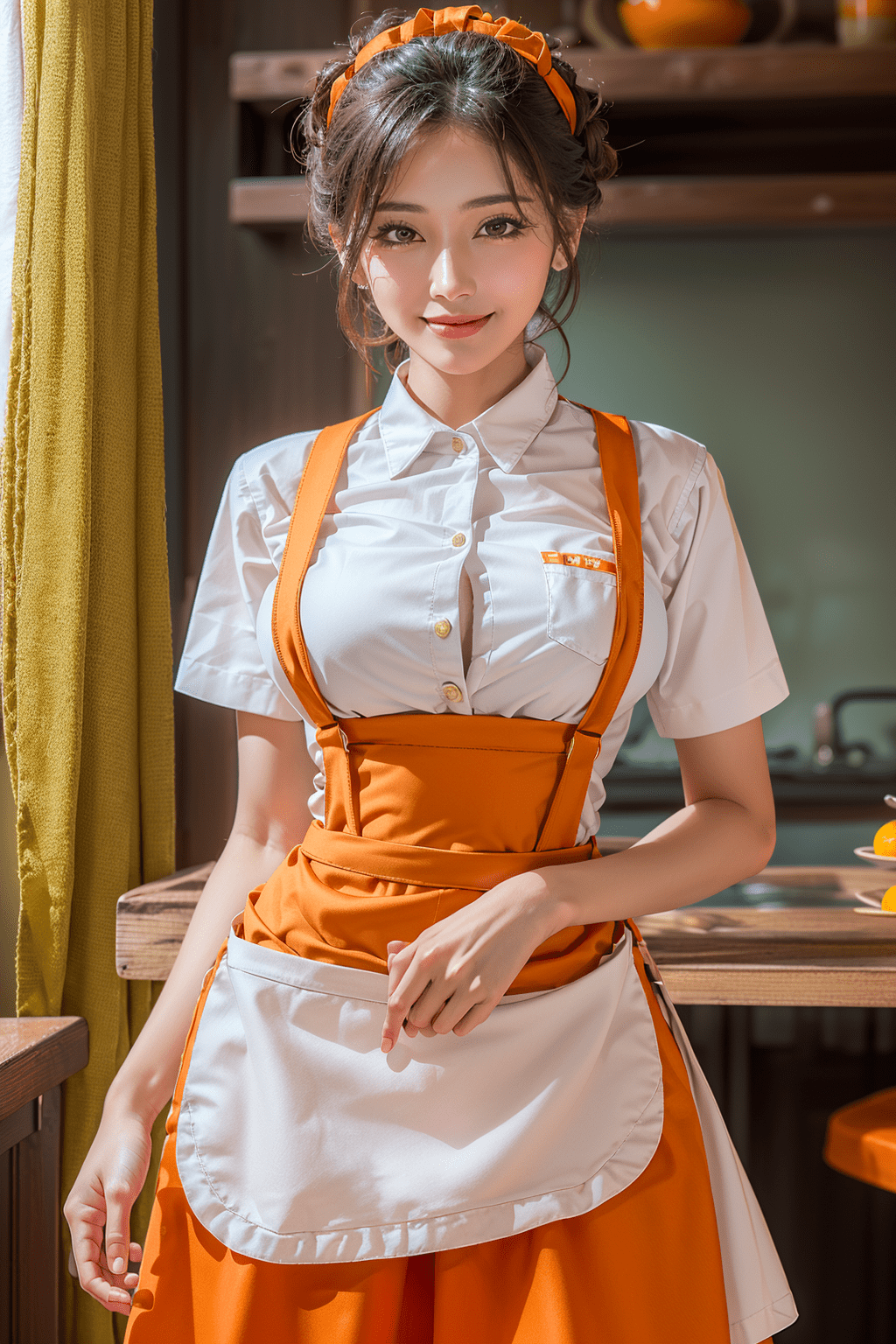 <クオリティアップ系のプロンプト> <キャラの容姿などのプロンプト> (restaurant, waitress, standing, holding a tray in the hand:1.2), (tight-fitting clothes:1.2), (tight white tank top:1.4), (wear a white tank top over naked body:1.1), (detailed tangerine orange yoga shorts:1.4), (wearing tangerine yoga shorts over pantyhose),(owl-print on tank top), (plunking neckline:1.2), bare shoulder, plump thighs, <表情、照明、その他のプロンプト>